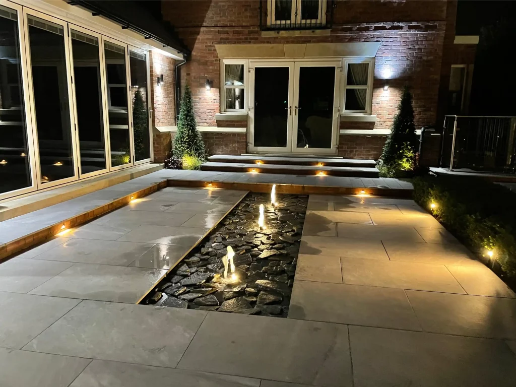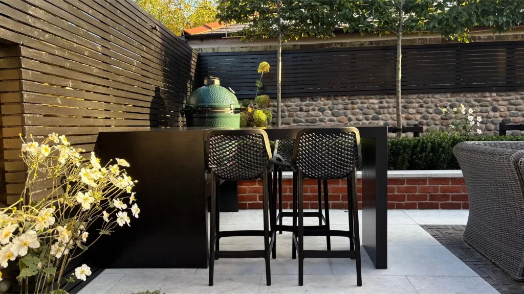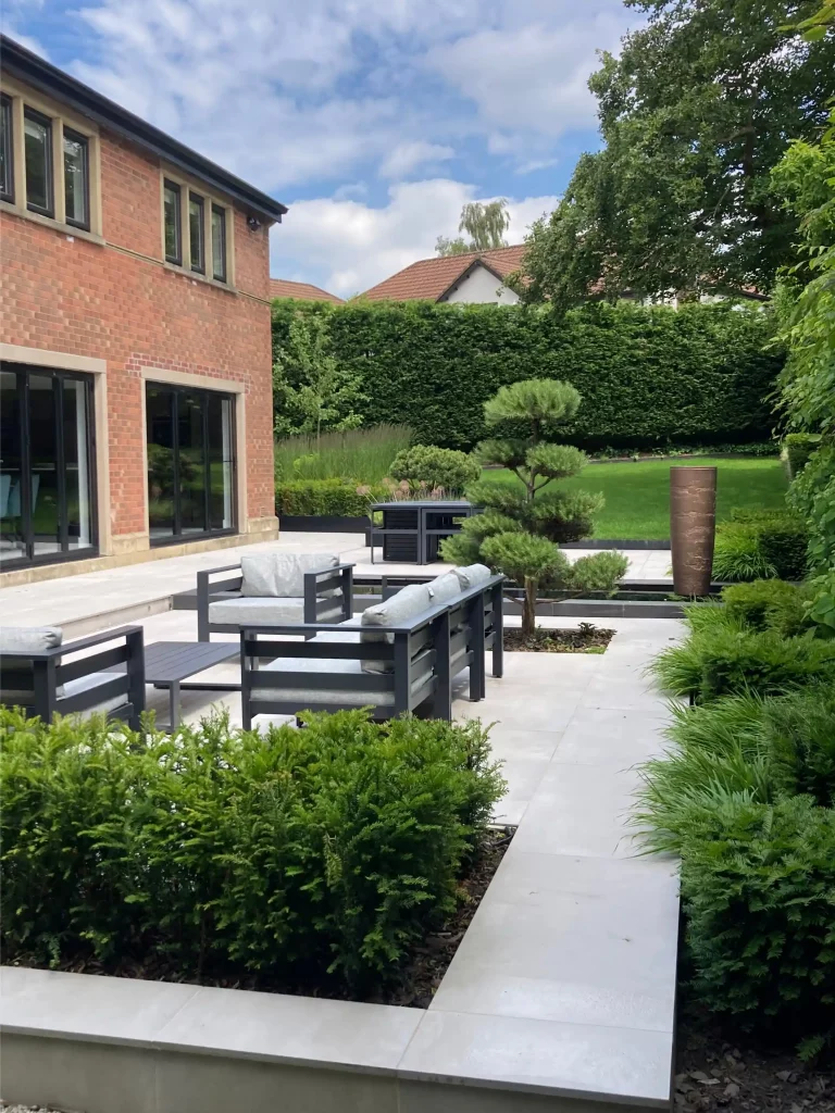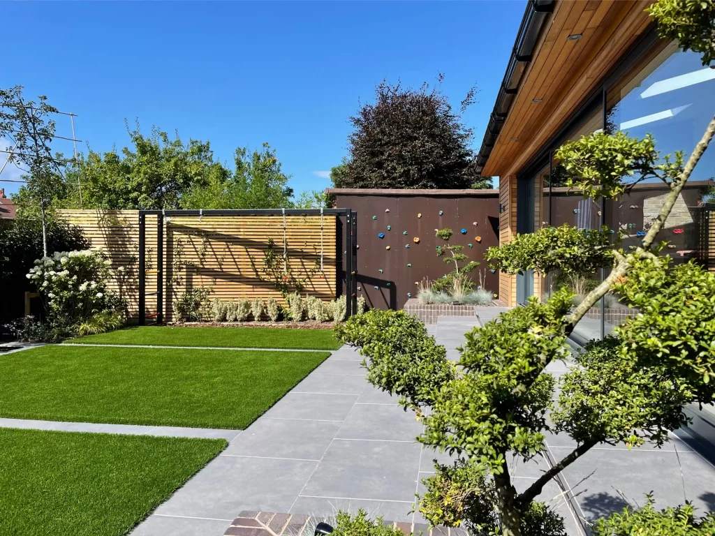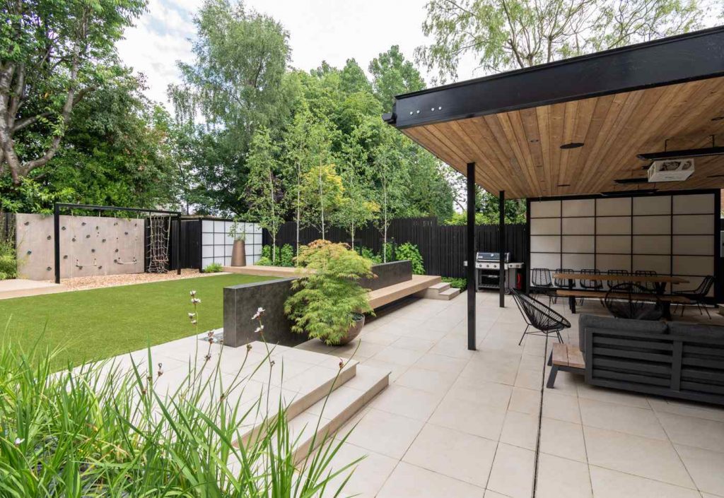 This sophisticated family garden designed by Vision Landscapes incorporates a large artificial lawn which frames the focal point of a bespoke corten steel water feature. This is the main focal point looking out from the newly built kitchen extension. Steps running the length of the newly installed sliding doors are constructed using clay paver up […]