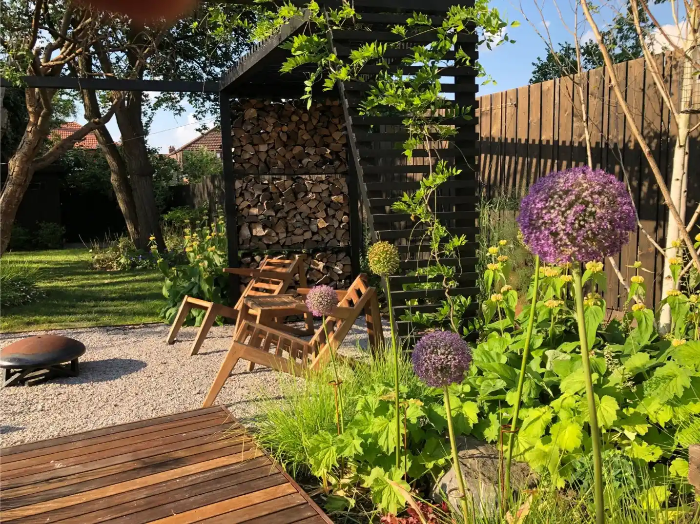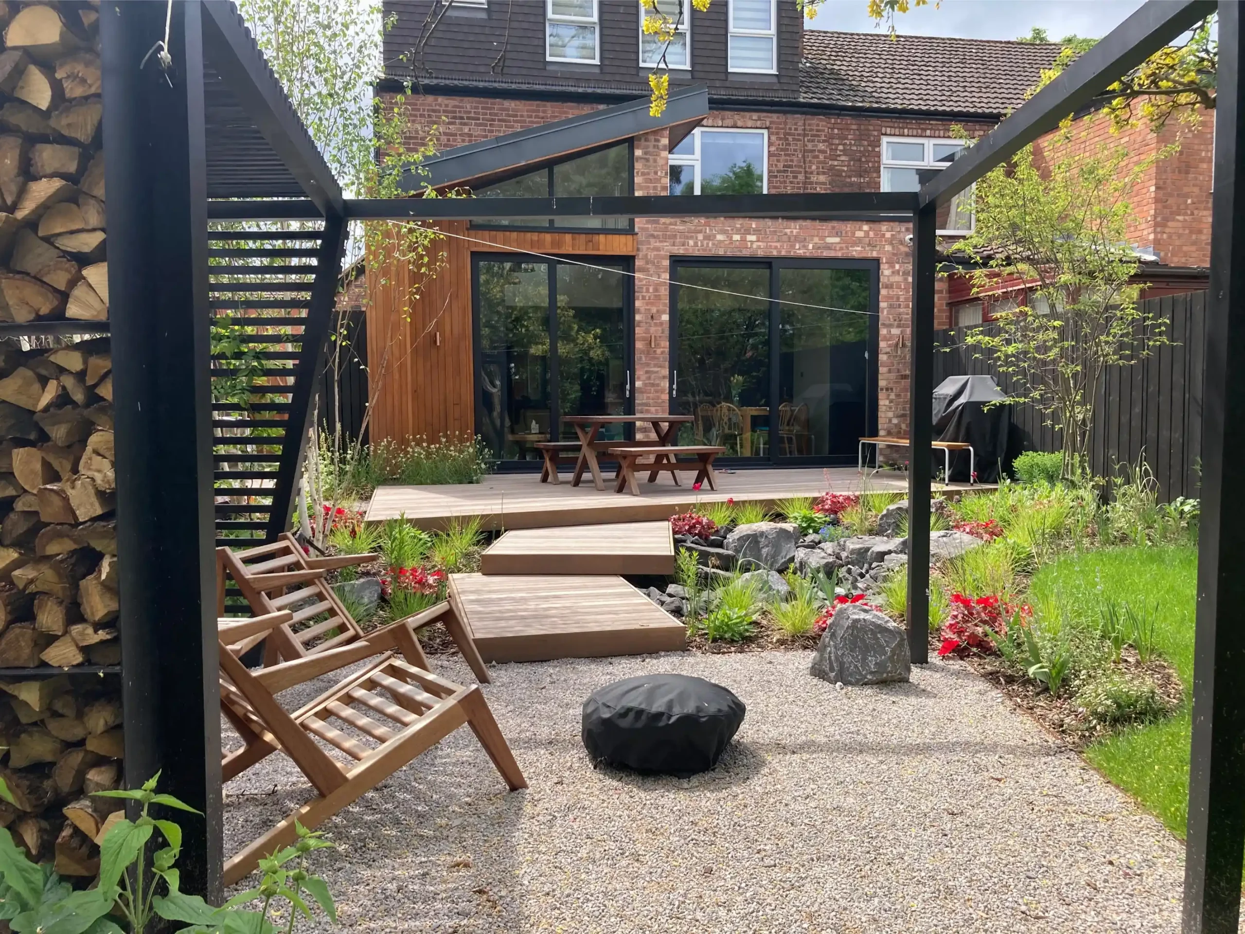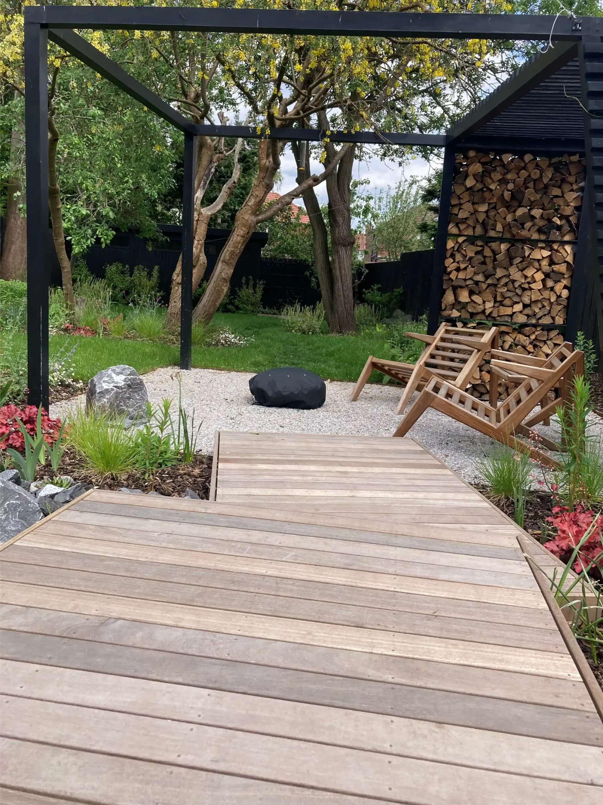 Cantilever hardwood deck steps seem to hover over the wildlife pond and lead down to a bespoke timber pergola, which in turn frames the gravel patio. This pergola was painted black to match the bespoke fencing and included a custom steel log store.
